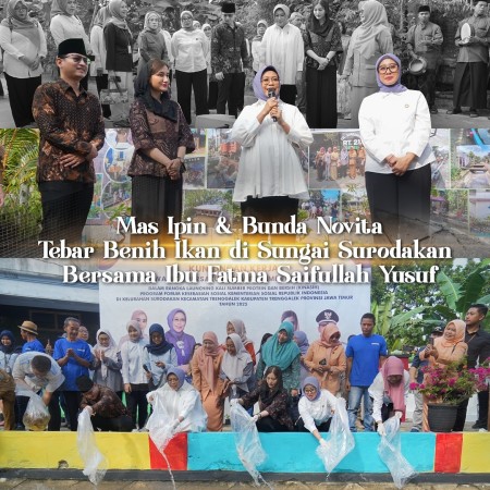 Bupati Trenggalek Mochamad Nur Arifin dan Bunda Novita menebar benih ikan nila di salah satu sungai di Kelurahan Surodakan Trenggalek.Tebar ...