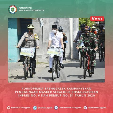 Forum Komunikasi Pimpinan Daerah (Forkopimda) bersama tokoh masyarakat Kabupaten Trenggalek kampanyekan penggunaan masker kepada masyarakat. Ajakan berdisiplin menggunakan masker yang dikemas dengan acara olahraga bersama ini, sekaligus mensosialisasikan Inpres No. 6 Tahun 2020 dan Perbup No. 31 Tahun 2020 tentang peningkatan disiplin dan penegakan hukum protokol kesehatan dalam pencegahan dan pengendalian Covid-19, Kamis (10/9/2020).