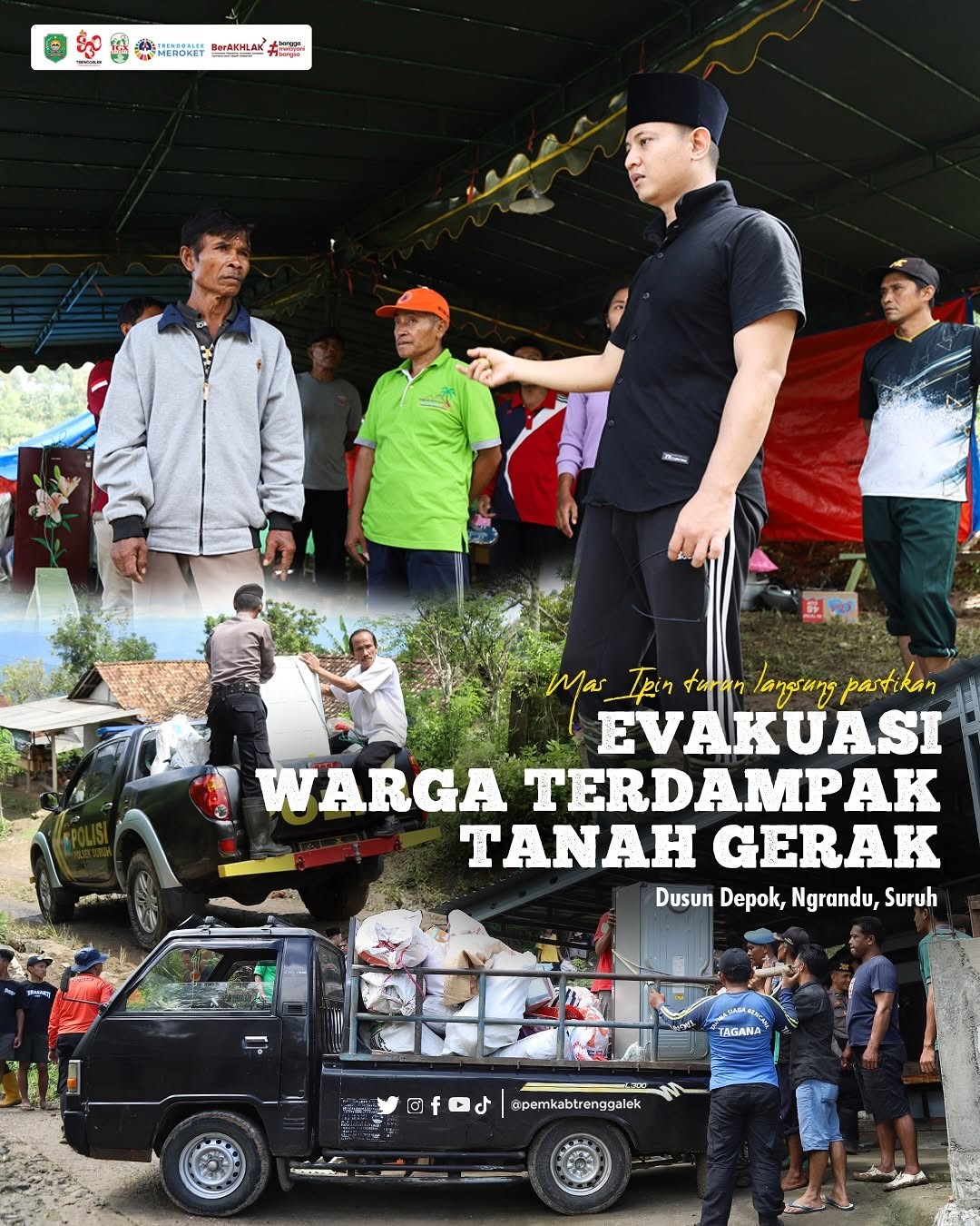 Turun langsung ke lapangan, Bupati Trenggalek Mochamad Nur Arifin meninjau lokasi kejadian tanah gerak dan melakukan arahan evakuasi terhadap warga terdampak. Mas ipin menargetkan hari ini dilakukan evakuasi terakhir melihat kondisi yang menghkawatirkan dan situasi cuaca sempat mendung.