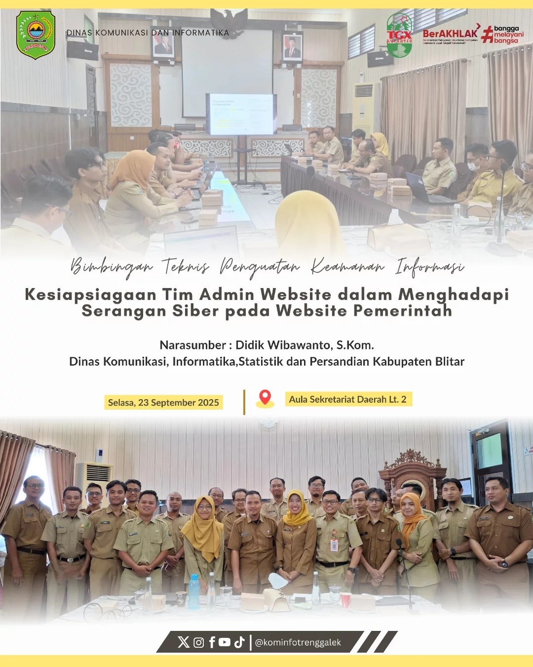 Dinas Kominfo Kabupaten Trenggalek gelar Bimtek Penguatan Keamanan Informasi : Kesiapsiagaan Tim Admin Website dalam Menghadapi Serangan Siber pada Website Pemerintah dengan narasumber utama Didik Wibawanto, S.Kom dari Dinas Kominfo Kabupaten Blitar pada Selasa, 23 September 2025.