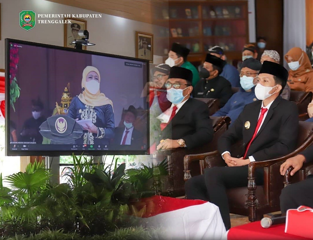 Wakil Bupati Trenggalek, Syah Muhamad Natanegara bersama jajaran Forkopimda mengikuti upacara peringatan Hari Jadi Ke-76 Provinsi Jawa Timur secara virtual dari Pendhapa Manggala Praja Nugraha, Rabu (13/10/2021).