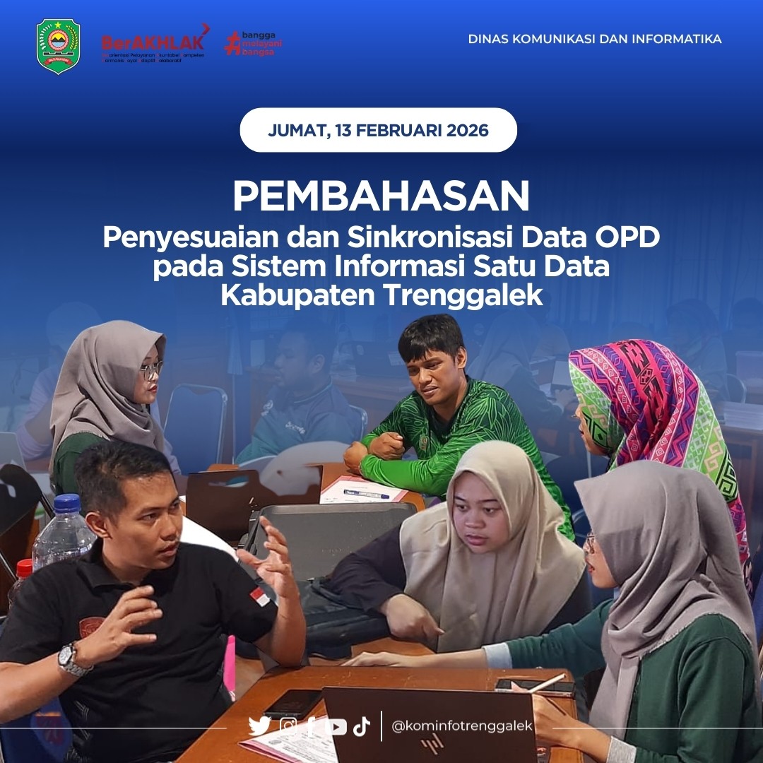 Guna menindaklanjuti adanya perubahan pada nomenklatur Perangkat Daerah, Dinas Komunikasi dan Informatika Kabupaten Trenggalek melalui Bidang Statistik Sektoral dan Persandian menyelenggarakan Kegiatan Pembahasan Penyesuaian dan Sinkronisasi Data Perangkat Daerah pada Sistem Informasi Satu Data Kabupaten Trenggalek, Jumat (13/02/2026).