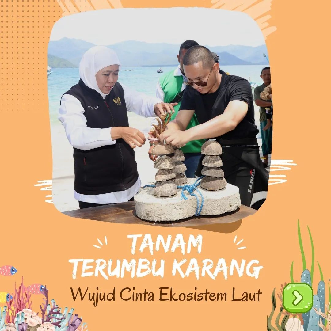 Gubernur Jatim Khofifah Indar Parawansa didampingi Bupati Trenggalek Mochamad Nur Arifin lakukan replanting atau tanam terumbu karang di kawasan Pantai Mutiara, Watulimo Trenggalek, Selasa (21/2/2023).