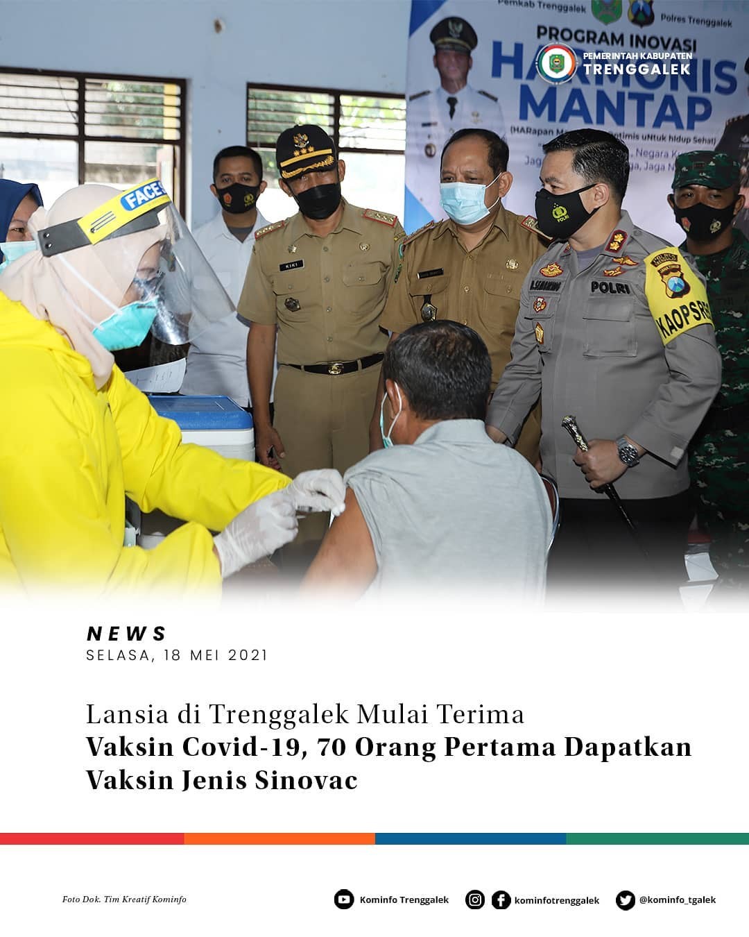 Vaksinasi perdana bagi lansia ini berlangsung di Aula Kantor Kelurahan Sumbergedong Trenggalek. Selasa (18/5/2021) terdapat 70 orang lansia yang menerima suntikan vaksin Covid jenis sinovac.
