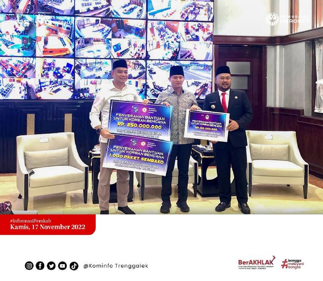 Bantuan diserahkan oleh Walikota Surabaya Eri Cahyadi dan Bupati Gresik Fandi Akhmad Yani yang diterima langsung oleh Bupati Trenggalek Mochamad Nur Arifin di Balaikota Surabaya, Kamis (17/11/2022).