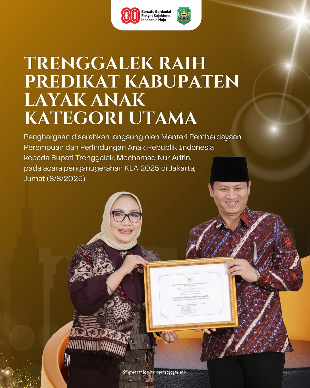 Penghargaan diserahkan langsung oleh Menteri Pemberdayaan Perempuan dan Perlindungan Anak Republik Indonesia kepada Bupati Trenggalek, Mochamad Nur Arifin, pada acara penganugerahan KLA 2025 di Jakarta, Jumat (8/8/2025).